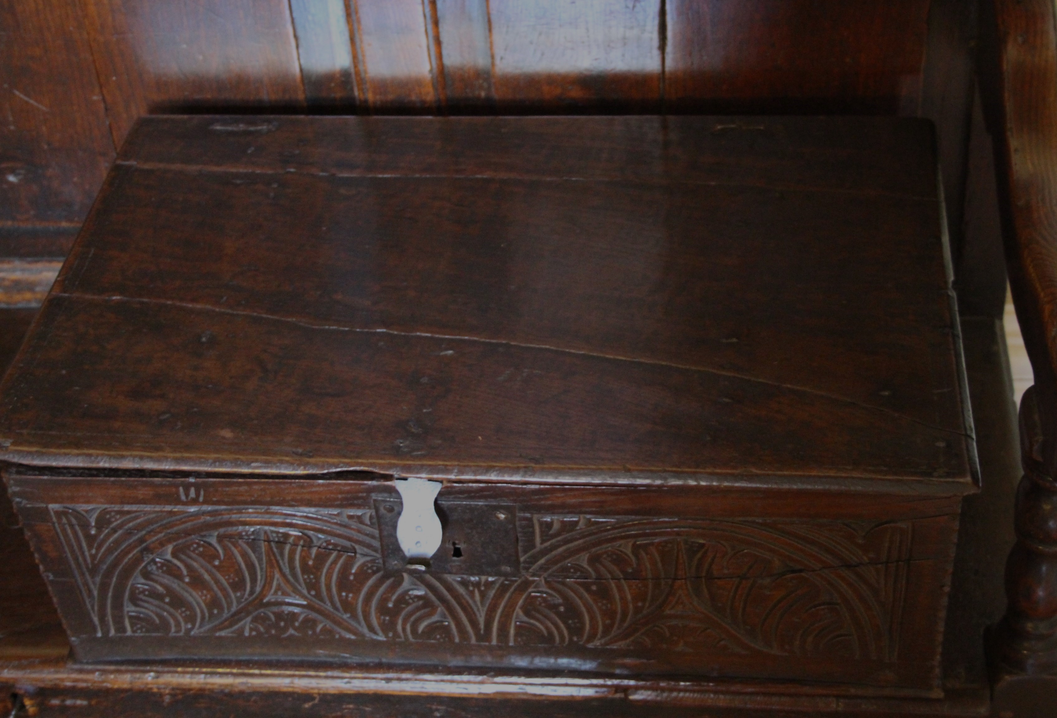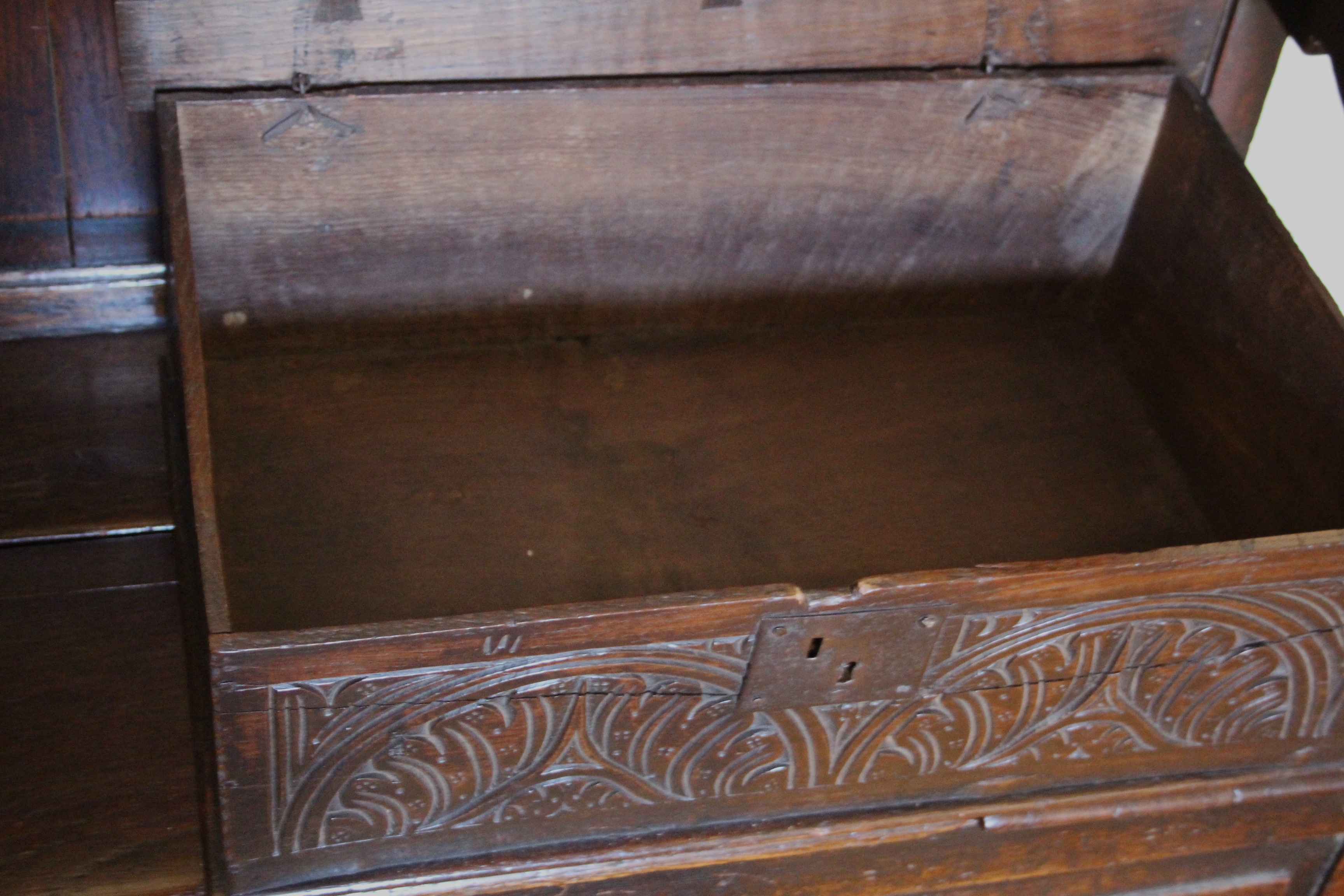 Charles II carved Oak Boarded Box, Somerset origin. Initials "WS"