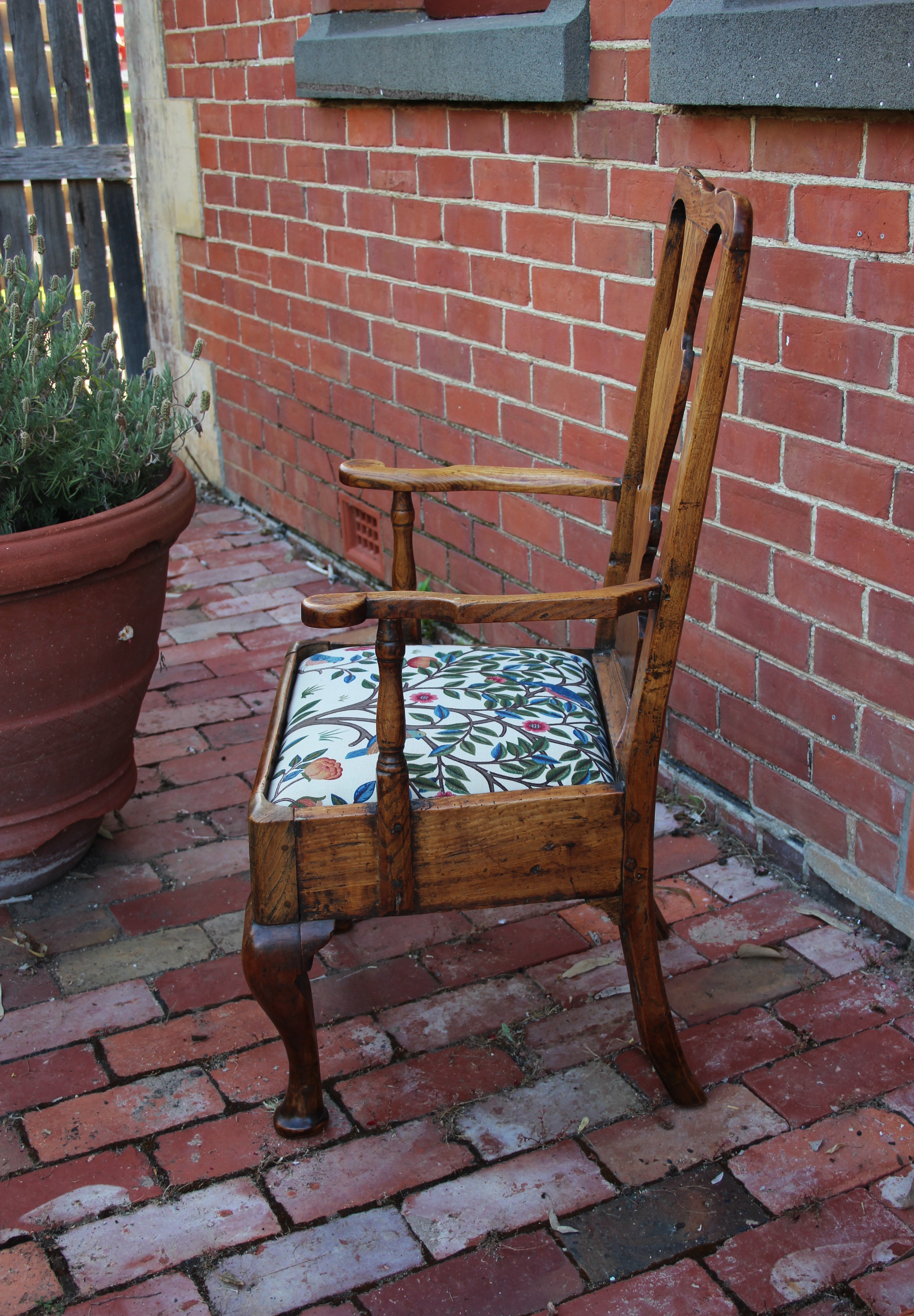 George II Provincial elm and fruitwood splat back elbow chair with drop-in seat, on cabriole legs. Covered in William Morris Kelmscott Tree design fabric.