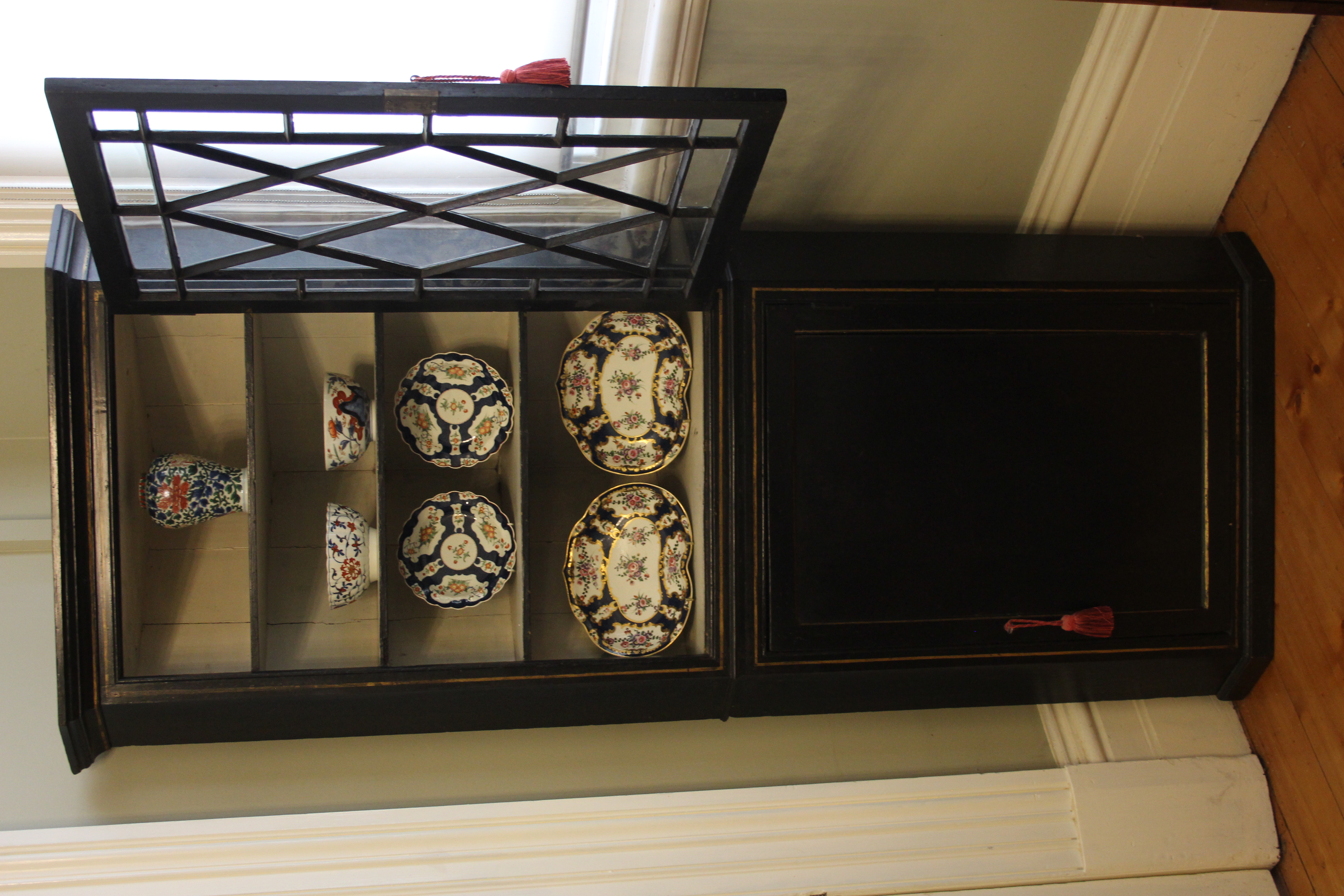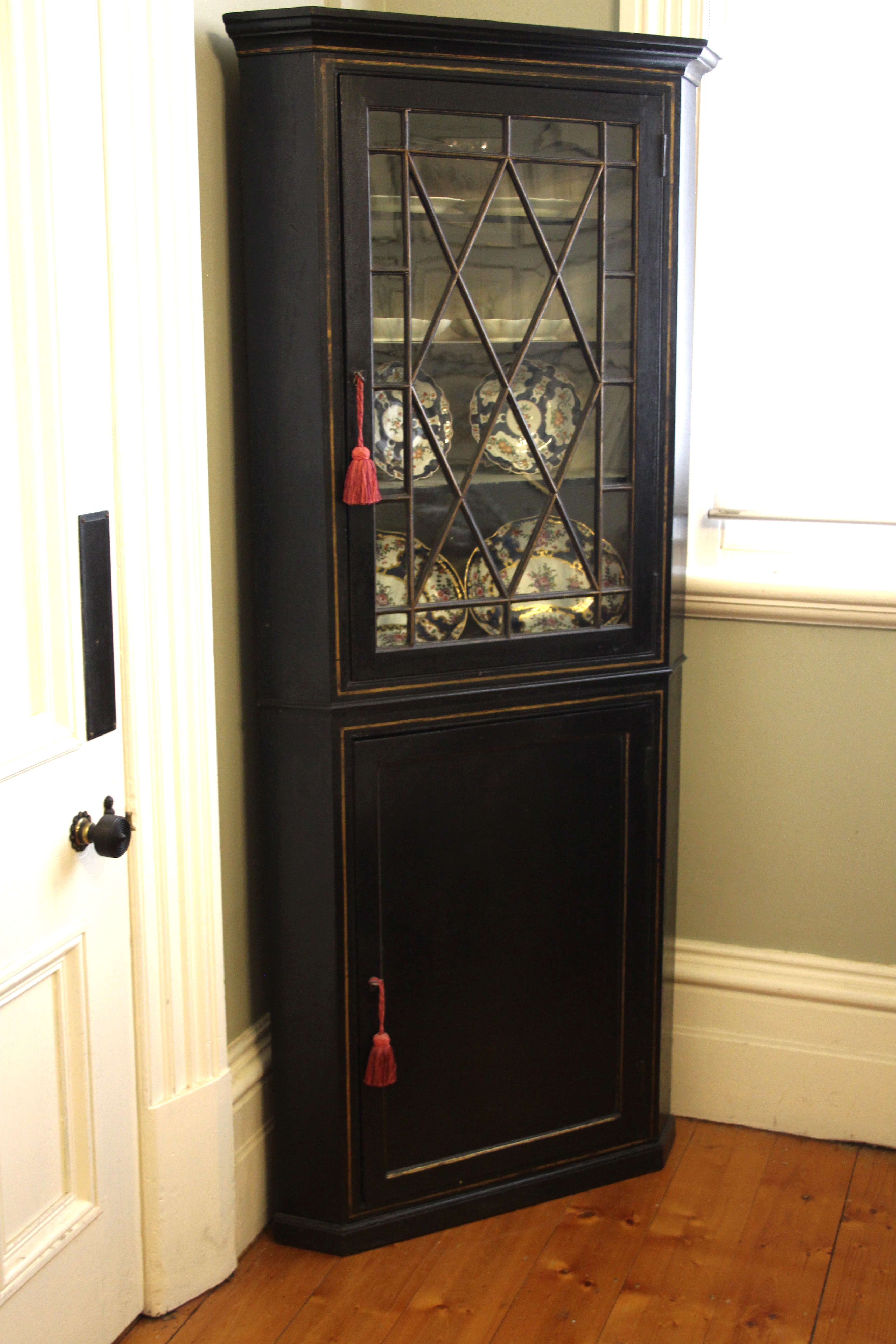 Georgian Pine two part Standing Corner Cupboard with original faded black finish.  The astragal glazed top with three fixed shelves.