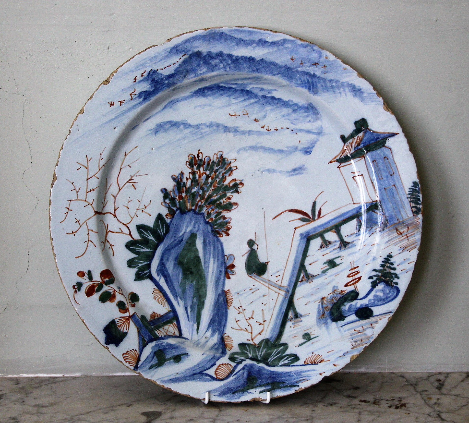 English Bristol Delft (LimeKiln Lane) dish with a rim-to-rim scene of a fisherman on a bridge. The decoration in blue on a pale blue glaze
