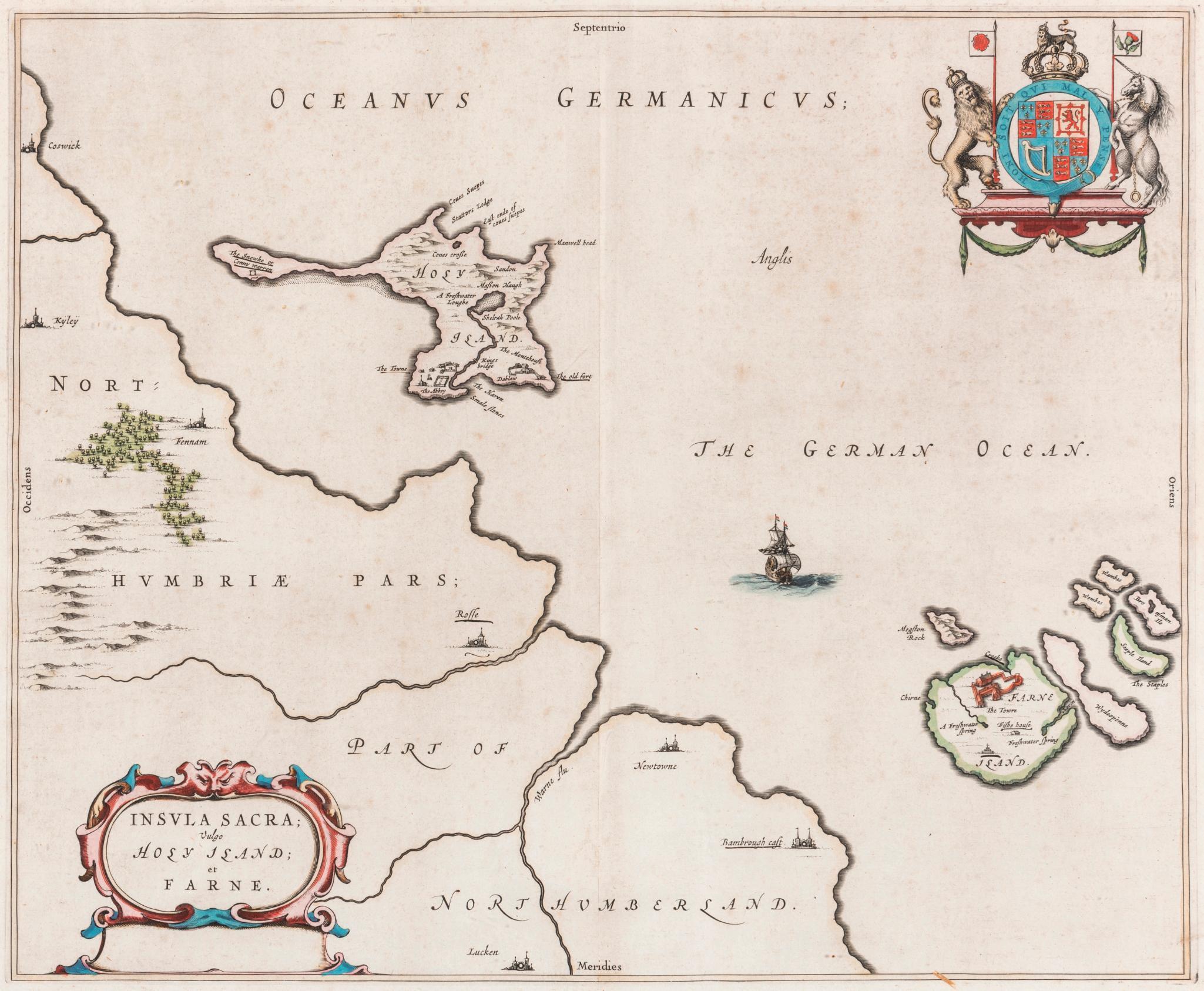 Map of Holy Island (Lindisfarne) Northumberland and Farne Island including the Stuart Coat of Arms 38.5 c 47.5 cms (image size)