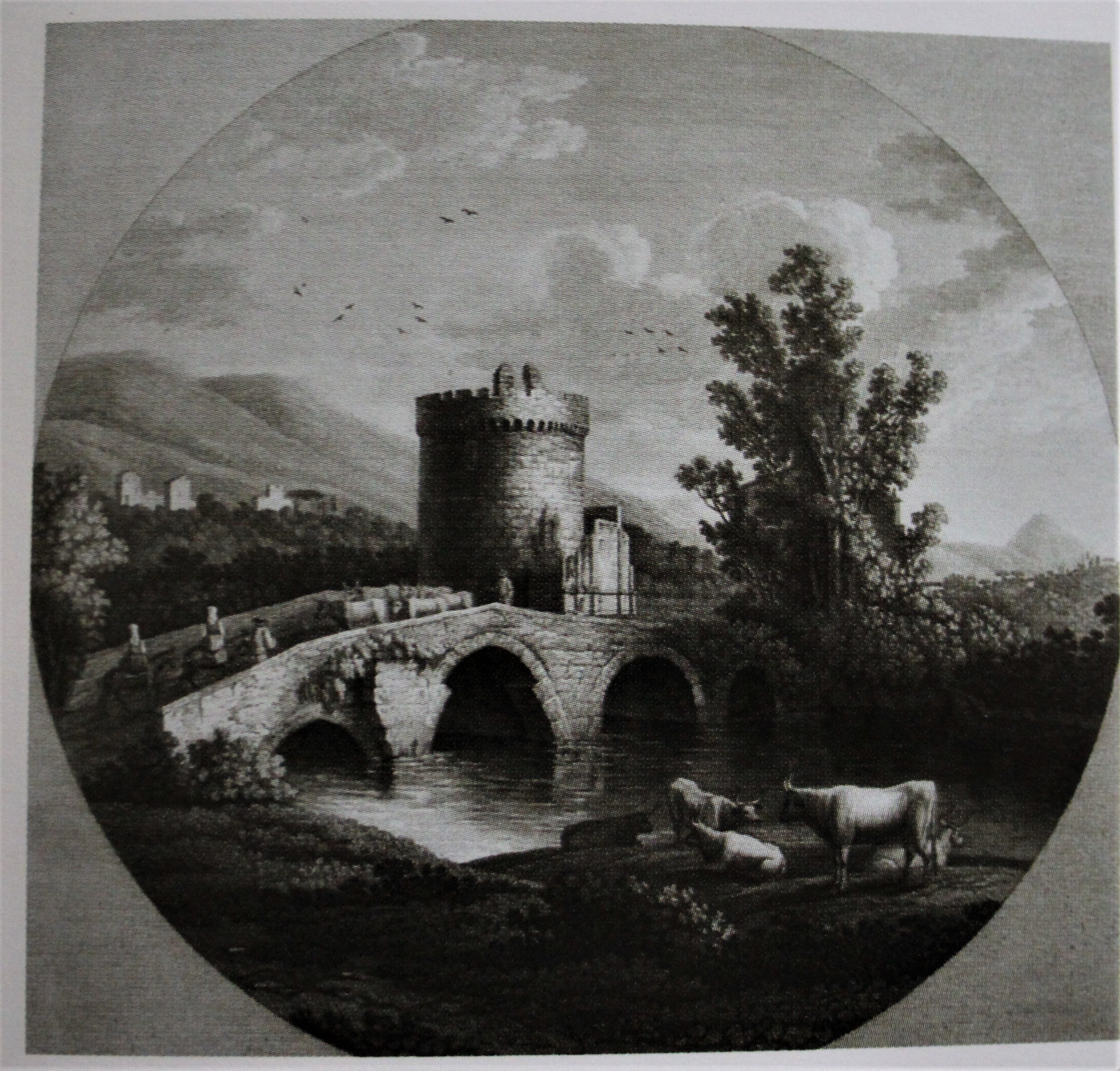 Spode dish with underglaze print of "The Bridge of Lucano near Tivoli to the East of Rome". The tower is the tomb of Plautius Lucanus.